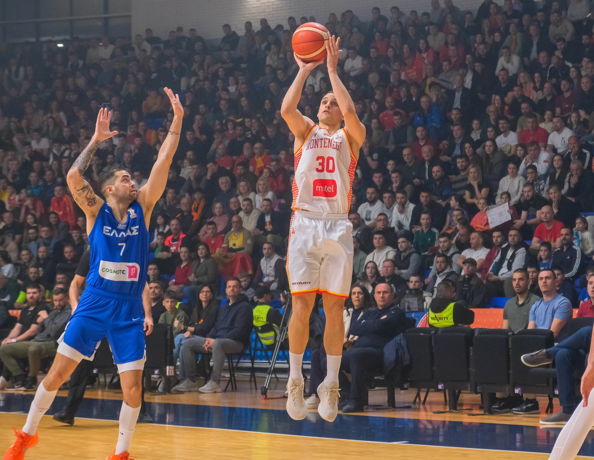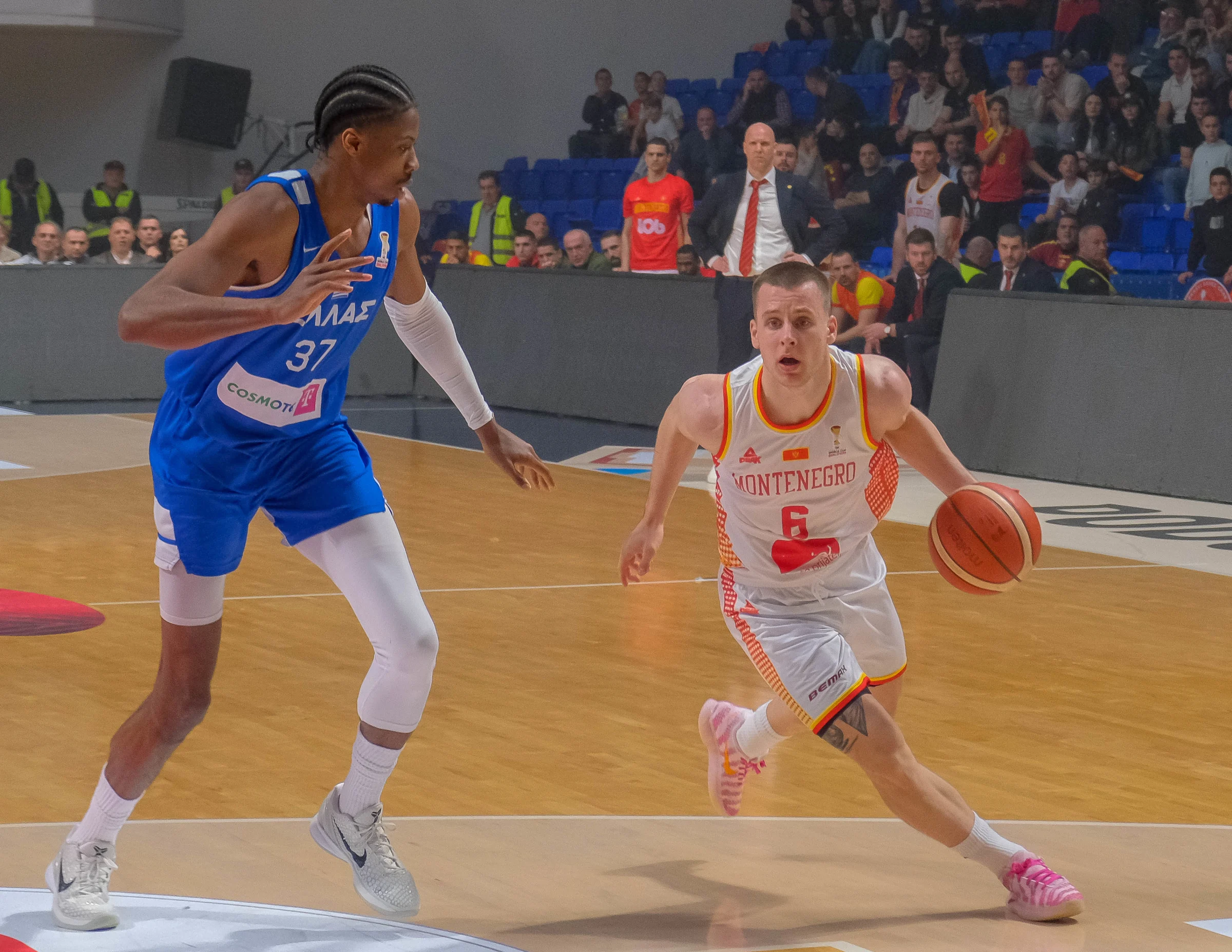 U sjajnoj atmosferi pune Morače, čime su navijači nagradili naše košarkaše za veliku pobjedu u Atini, Crna Gora je krenula nadahnuto – trojkom Nidama, pa poenima Hadžibegovića i najavila da vjeruje u novi podvig, jer ovaj tim je prethodnom pobjedom nad Grcima pokazao da ima karakter. Ipak i Grčka je imala svoju računicu, nakon prvog poraza u ovoj kampanji, pa je vrlo brzo odgovorila i poenima Mitoglua i sa dvije trojke Toliopulosa napravila 8:0, za vođstvo 15:8 u 4. minutu. Nakon tajm auta Andreja Žakelja reagovali su i naši sa 5 vezanih poena, a trojkom Radončića prišli na poen zaostatka (16:17) u 8. minutu, što je bilo važno da se rivalu ne dozvoli bijeg već u ranoj fazi utakmice. Imali smo čak i dva napada za preokret, ali ipak poslije nekoliko propuštenih prilika Grčka je na kraju prve četvrtine vodila 22:18.