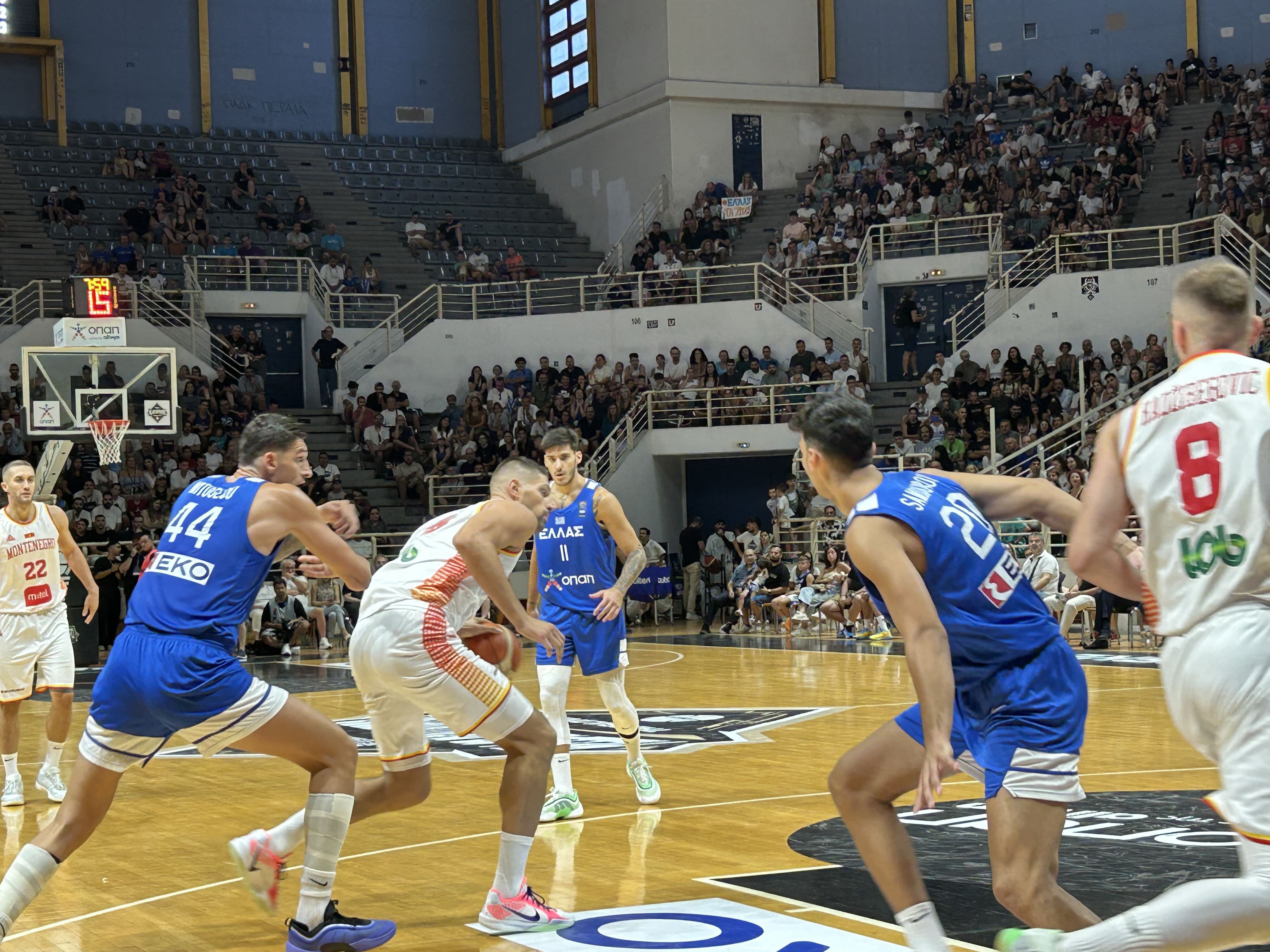 Naši su dobro otvorili utakmicu, poveli 19:12 u finišu prve četvrtine, zonom natjerali rivala na šuteve spolja koje nisu pogađali u visokim procentima. Grci su se ipak trgli i preokrenuli serijom 10:0, da bi se potom igralo u egalu i sa dosta promašaja na obje strane – naših reprezentativaca za 2 poena (8/22), a grčkih u šutu za 3 poena gdje su u prvom poluvremenu imali čak 21 pokušaj, a pogodili samo dvije trojke. Nakon 5 vezanih poena Mitoglua Grčka je povela 31:26, ali su odgovorili Olmen i Drobnjak za novo vođstvo naših, u finišu poluvremena i Vučević pa se na odmor otišlo uz prednost Crne Gore 35:32.