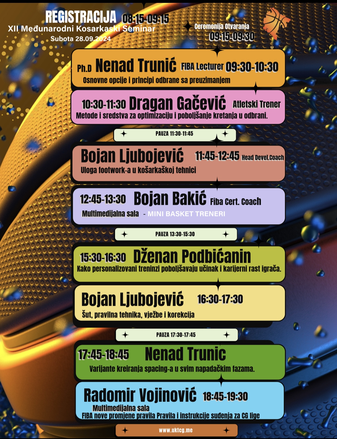 U sklopu seminara biće predstavljeni novi FIBA pravila, specifične situacije na terenu, kao i segmenti koji se tiču kondicione pripreme i individualnog i timskog rada. Poseban dio programa biće posvećen treninzima za mini basket.